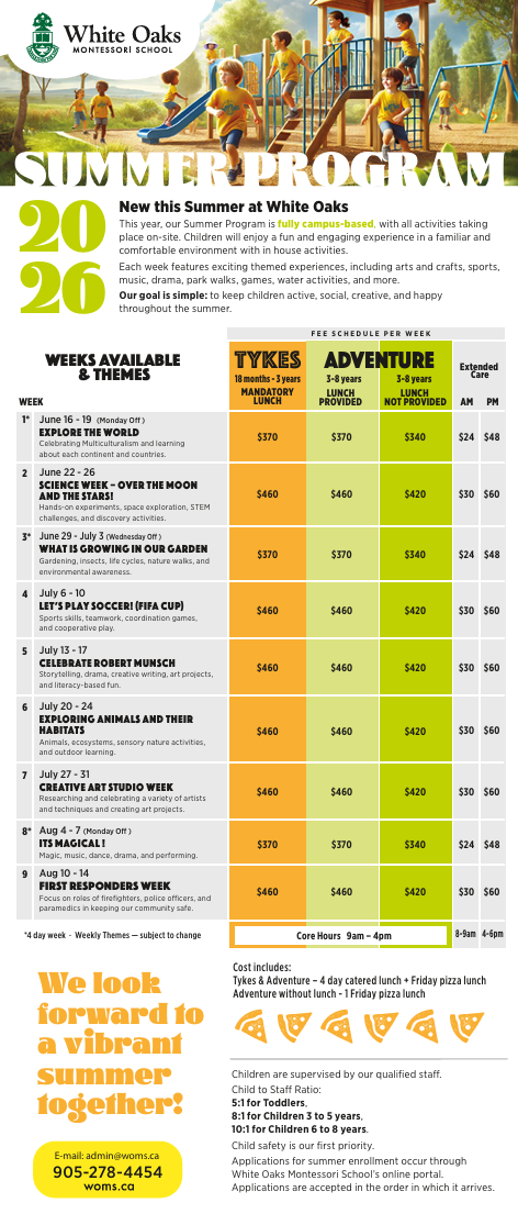We are delighted to share details about our 2026 Camp White Oaks Summer Program, designed for children 18 months to 8 years old. The program welcomes current students, children joining White Oaks in September, and neighbourhood families considering White Oaks for the upcoming school year who wish to experience our warm and connected school community.